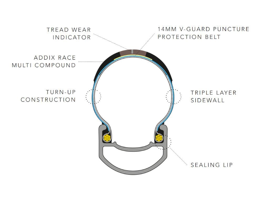 on the sides. This increases grip in bends without having a negative impact on rolling resistance or durability.